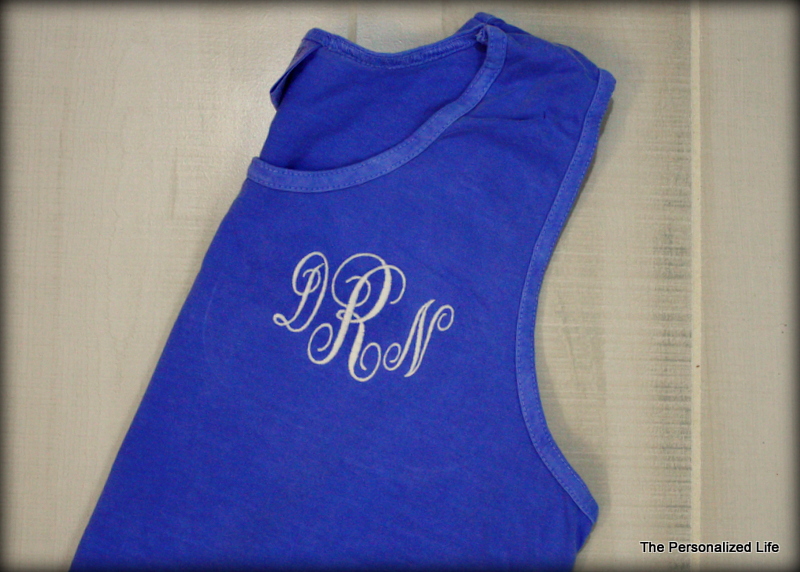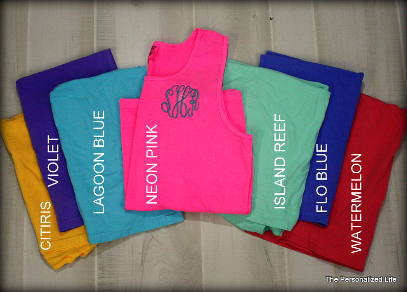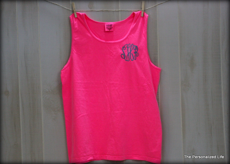 This Comfort Colors brand tank top will come monogrammed in your choice of font and thread color. It's the perfect addition to your summer wardrobe!