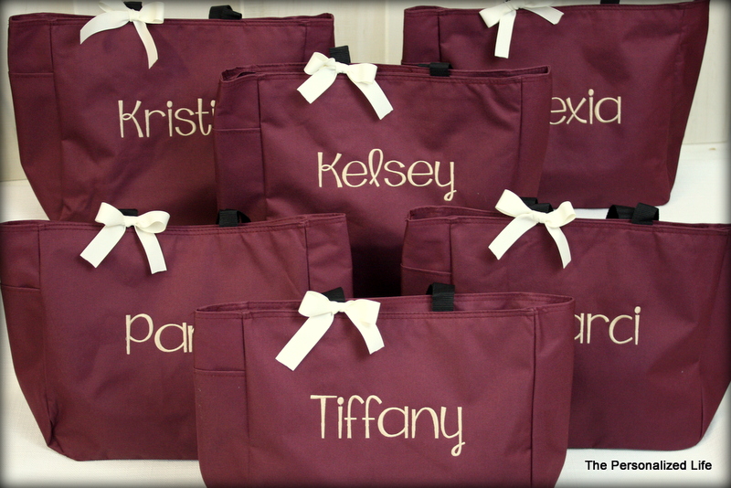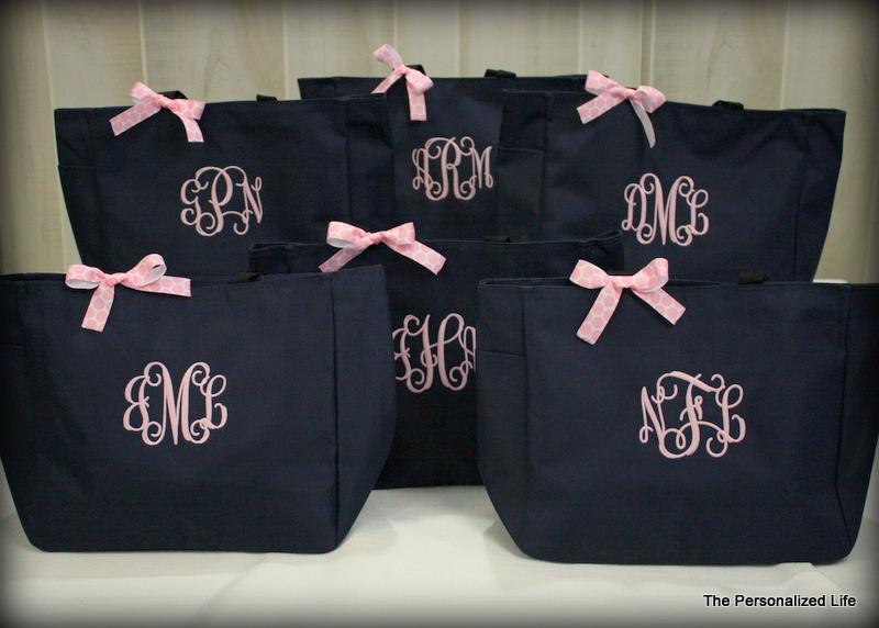 You will recieve 6 solid tote bags. You can choose to have a single letter, traditional 3 letter monogram, name, or initial with name sewn in the font and thread color of your choice. Each bag in the set can be different, feel free to be creative!