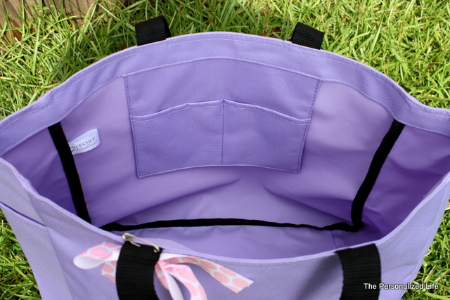The bag measures approximately 14"W x 12"H x 6"D, features small interior pockets, outside water bottle pocket, and black web handles.