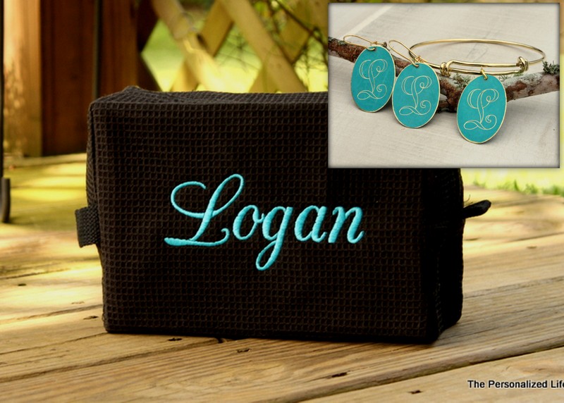 What a great girft set! Perfect for your bridesmaids or friends! This listing is for one monogrammed cosmetic bag, and initial bracelet, initial earrings, or all 3.