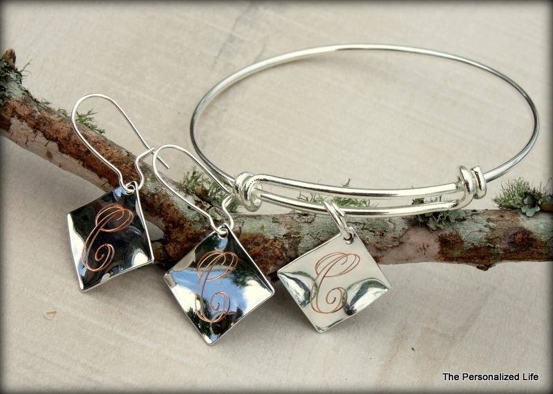 The bangle features a diamond shaped charm in the initial of your choice. The bangle expands to make it easy to slide on. The earrings feature the same diamond shaped charm in the initial of your choice. The charm is on a great hook closure keeping the earrings secure in your ear, no worrying about it slipping out.